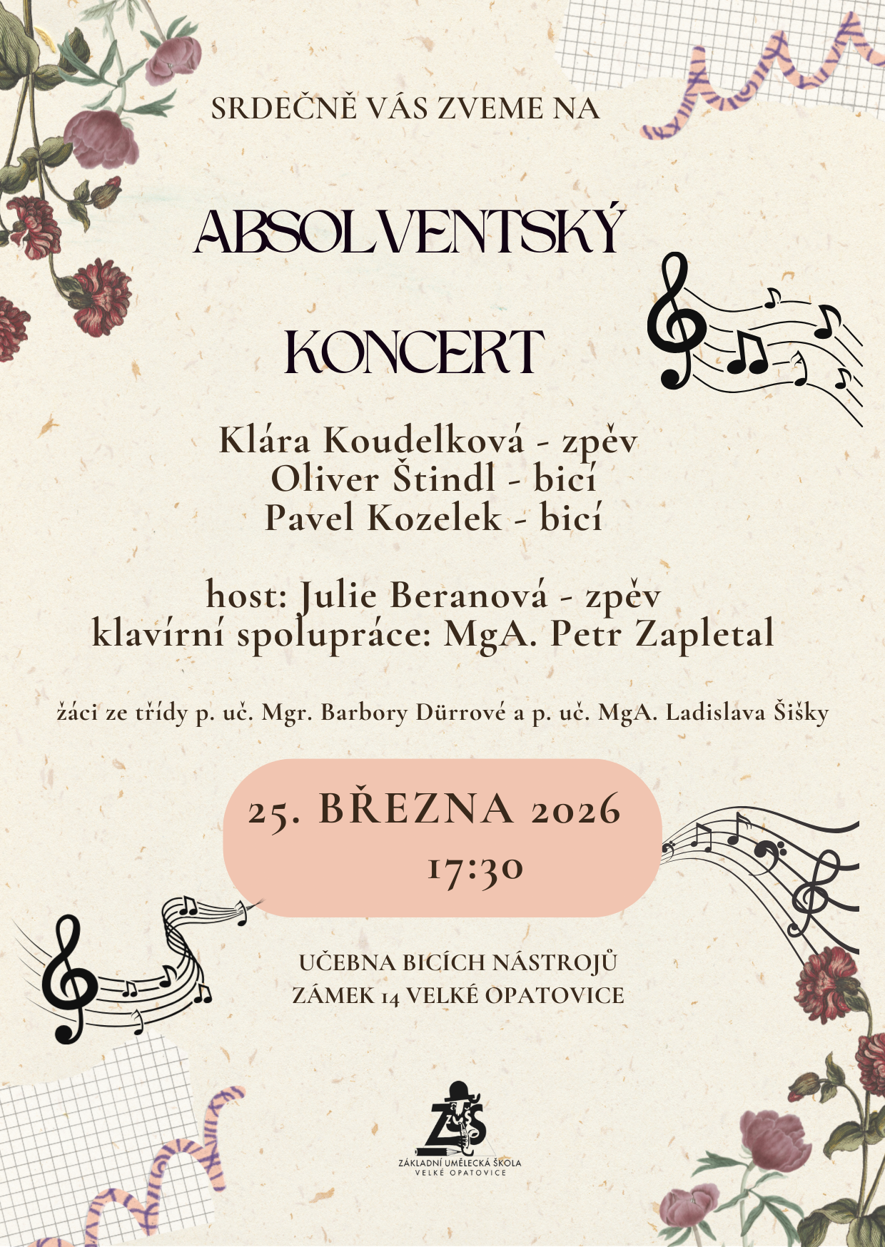 Srdečně vás zveme na absolventský koncert žáků ze třídy pana učitele Ladislava Šišky a paní učitelky Barbory Dürrové