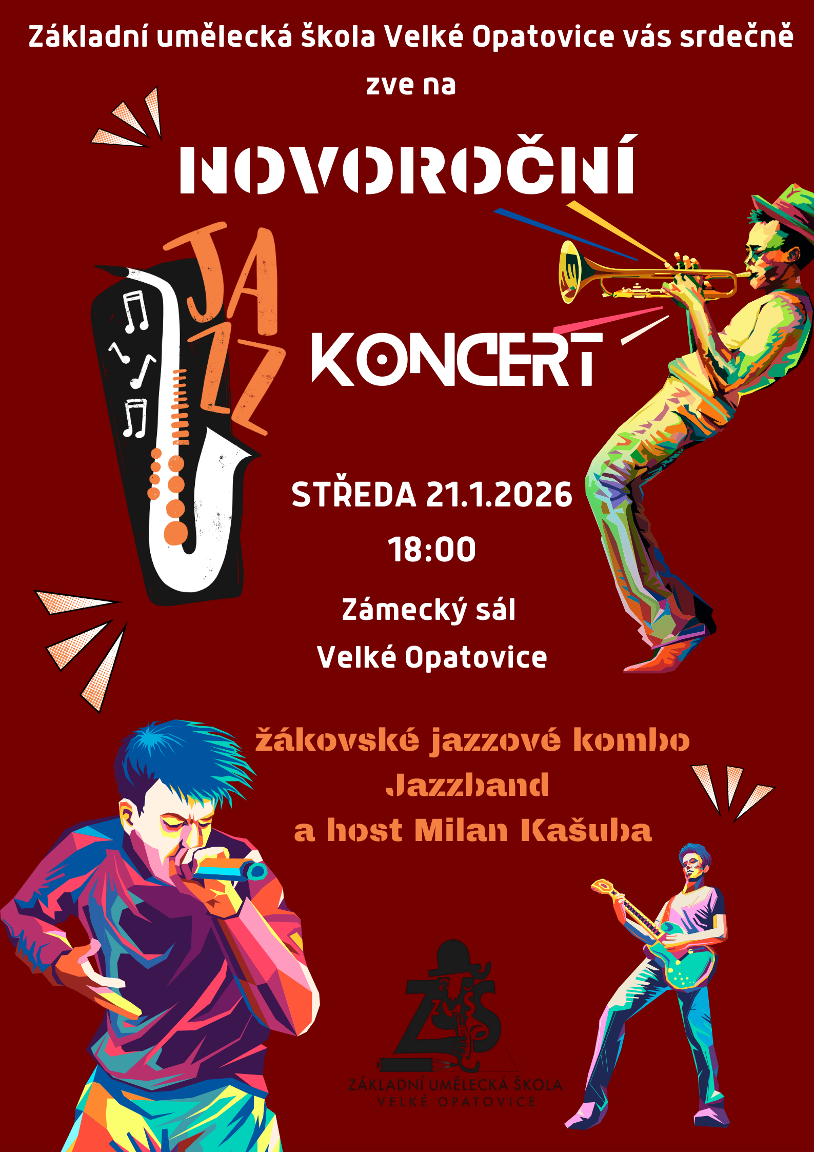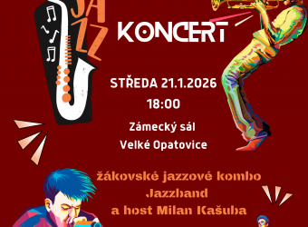 Srdečně vás zveme na novoroční jazzový koncert, kde vám zahraje jazzové žákovské kombo Jazzband a host Milan Kašuba, sál SKP.